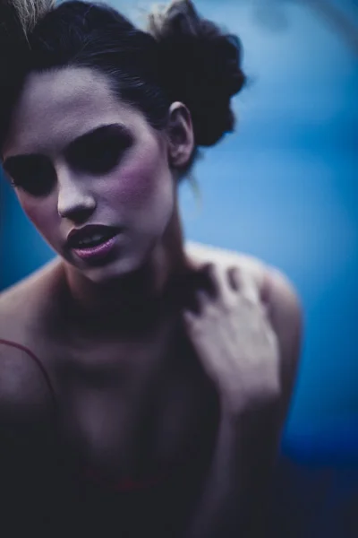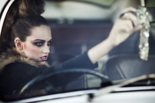 i got to the location just before noon, where hair and makeup was being finished up. we were shooting in an upstairs vintage bar in the city, with nude paintings hung in golden ornate frames on every inch of the brindle walls. after a couple of hours of shooting the first few pieces of the location, we changed coraline's hair and headed off to the next location; the middle of nowhere.